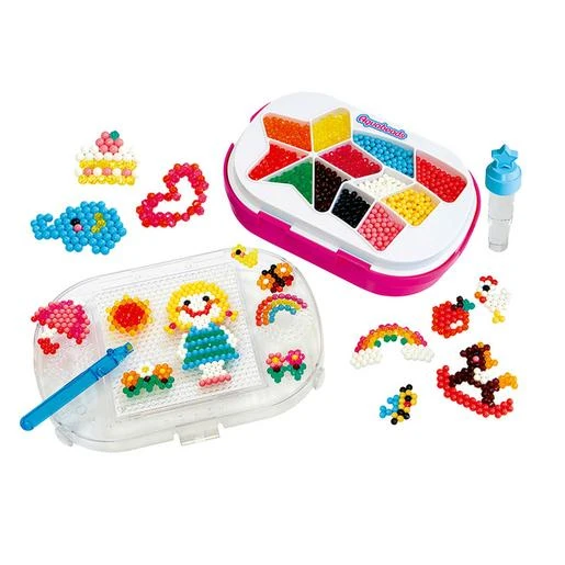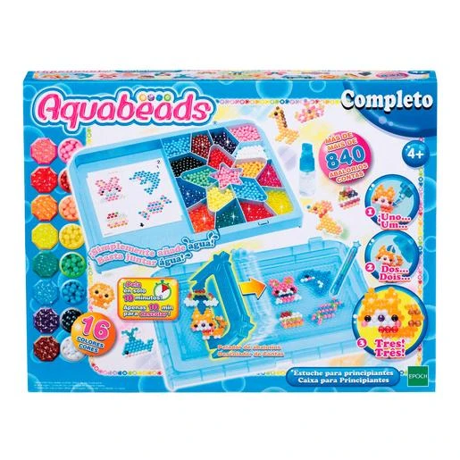 Aquabeads – Estuche para Principiantes, un estuche que incluye más de 840 abalorios con 16 colores diferentes, plantillas, 1 base, 1 pelador de abalorios y 1 vaporizador.