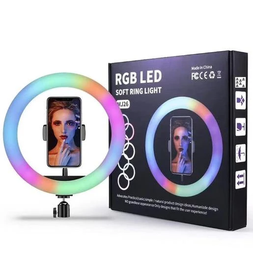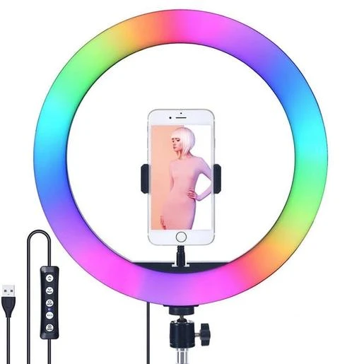 Aro de luz 26 cm Led 9 colores con trípode 210 cm. El Aro de luz Led de 26 cm está compuesto por 150 bombillas LED y ABS de alta calidad.