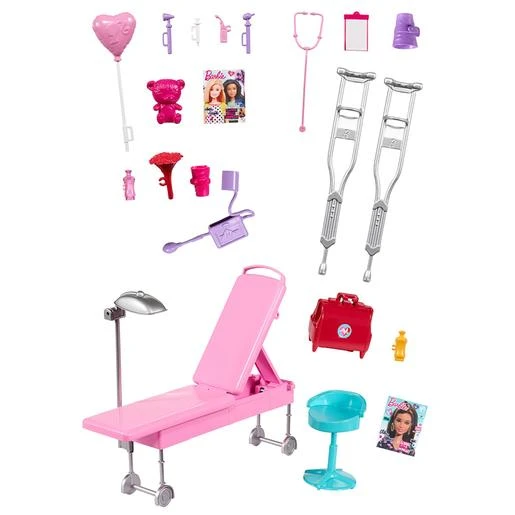 El hospital de Barbie está perfectamente equipado para emergencias médicas y la camilla rosa del paciente se puede ajustar para mayor comodidad.