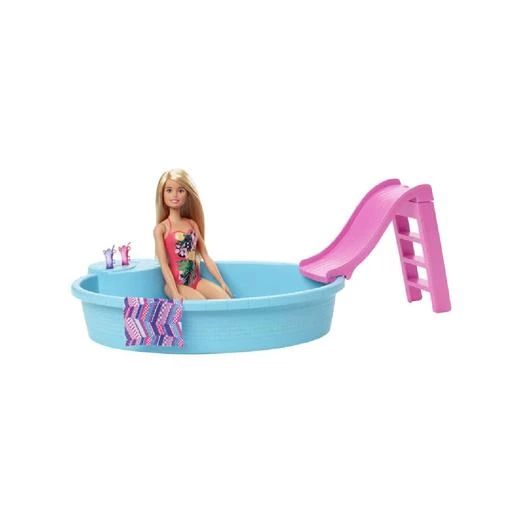 Barbie – Piscina con tobogán, muñeca de 30 cm aproximadamente con piscina, tobogán y accesorios.