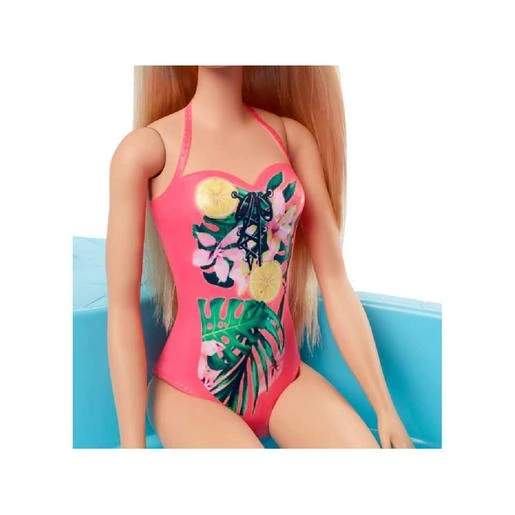 Barbie está lista para la piscina luciendo un traje de baño de colores vivos con divertidos dibujos de flores. ¡Las niñas podrán imaginar todo tipo de historias en verano con Barbie y su piscina!