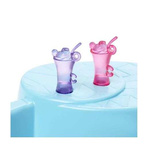 Incluye la muñeca Barbie junto con dos refrescos y dos posavasos y una toalla con un estampado colorido para ambientar un día de verano perfecto.