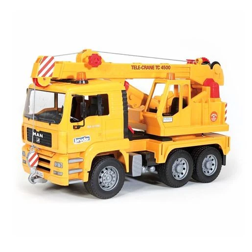 Bruder – Camión con Grúa MAN Amarillo, un camión grúa a escala 1:16 con retrovisores plegables y cabina abatible.
