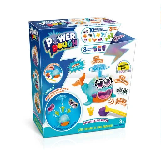 Power Dough – Peces, un pack que incluye 3 botes de pasta de modelar, 10 accesorios para decorar y 3 piezas electrónicas.