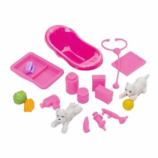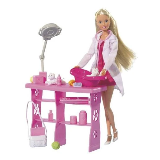 La muñeca viene con una mesa de reconocimiento, dos perros y 24 accesorios: estetoscopio, martillo, jeringa, termómetro, medicina, cuenco, bañera…