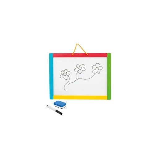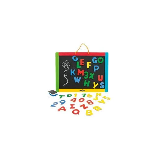 Tiene una cara negra para dibujar con tiza y una superficie blanca magnética para pegar y jugar con las formas coloridas.