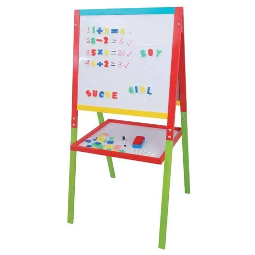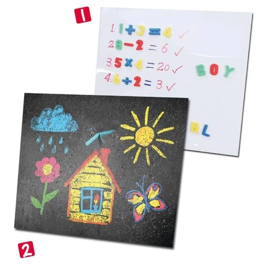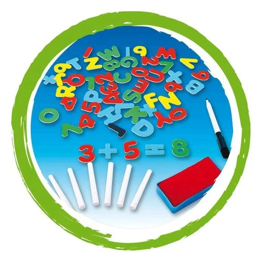 En una superficie puedes escribir con el rotulador borrable adecuado o componer palabras y operaciones matemáticas con los imanes y en la otra superficie dibujar con las tizas incluidas. ¡Diviértete jugando con tus amigos!