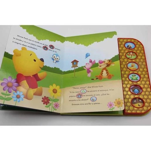 Este libro destaca por su módulo mágico de textura de panel, que simula la sensación real de un panal, ofreciendo así una experiencia táctil única e interesante. Además, posee seis botones de sonido que complementan la narración y despiertan la curiosidad de los niños, permitiéndoles disfrutar aún más de las travesuras de Winnie Pooh y sus amigos en busca de miel.