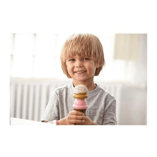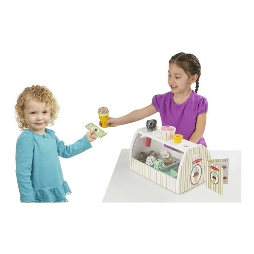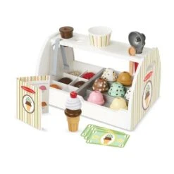 La resistente encimera de madera tiene capacidad para ocho bolas de helado de diferentes sabores, seis coberturas variadas, dos conos, un vaso de plástico, una cuchara para helado, pinzas y una cuchara de madera.