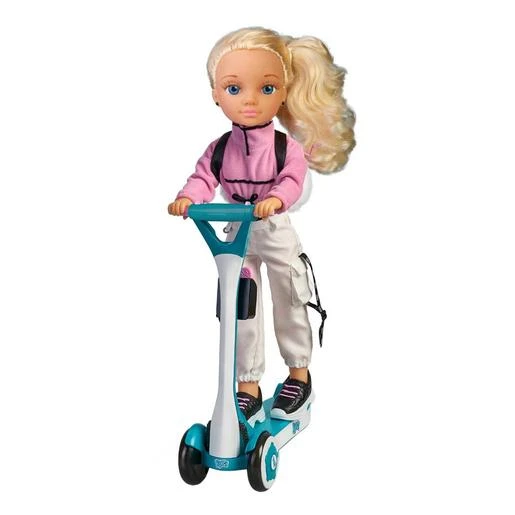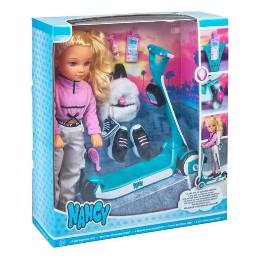La muñeca Nancy puede sujetarse al scooter mientras conduce.