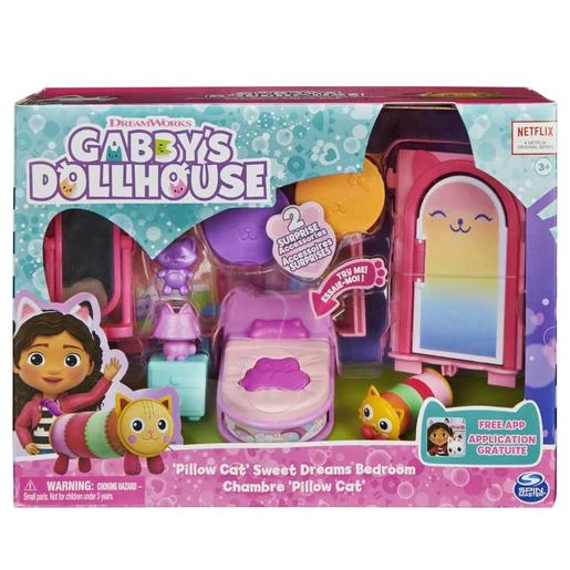 Abre la misteriosa caja y descubre una serie de maravillosos accesorios, como un suave gatito de peluche, un libro que se abre y un antifaz para dormir que Sueñigata puede usar durante el juego. ¡Hay muchas sorpresas esperándote en el dormitorio de La Casa de Muñecas de Gabby!
